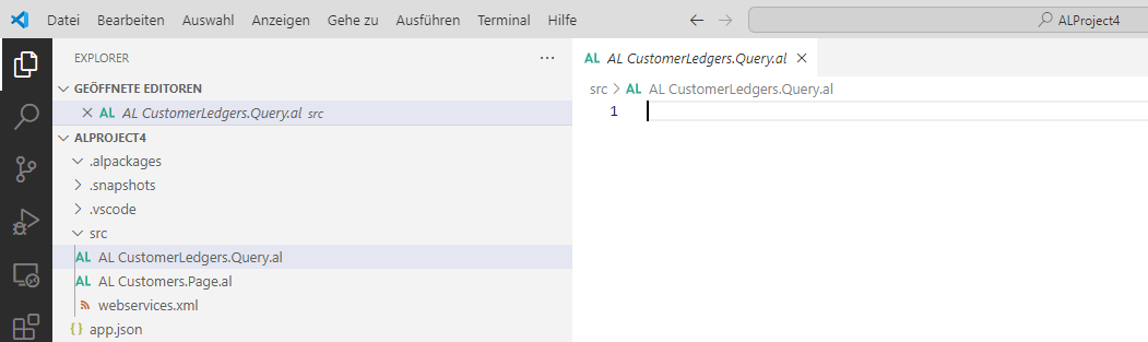 .al-Datei zu Ihrem Projekt hinzu, und nennen Sie sieCustomerLedgers.Query.al.Verwenden Sie den Ausschnitt tquery, um das Skelett der neuen Abfrage zu erstellen: