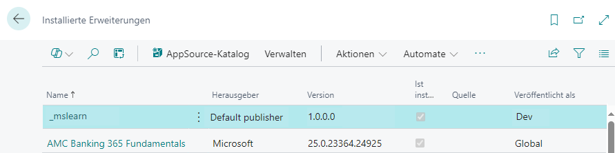 Öffnen Sie in Business Central die Seite Erweiterungsmanagement, um zu überprüfen, ob Ihre Erweiterung erfolgreich veröffentlicht und installiert wurde.