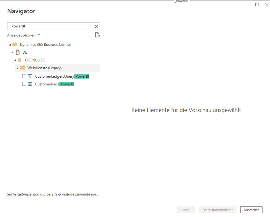 <?xml version="1.0" encoding="UTF-8"?> <ExportedData> <TenantWebServiceCollection> <TenantWebService> <ObjectType>Page</ObjectType> <ServiceName>CustomerPage_PowerBI</ServiceName> <ObjectID>50101</ObjectID> <Published>true</Published> </TenantWebService> <TenantWebService> <ObjectType>Query</ObjectType> <ServiceName>CustomerLedgersQuery_PowerBI</ServiceName> <ObjectID>50101</ObjectID> <Published>true</Published> </TenantWebService> </TenantWebServiceCollection> </ExportedData>Für jede Seite oder Abfrage, die Sie als Webdienst in Business Central veröffentlichen müssen, ist ein Eintrag in diese XML-Datei vorzunehmen.