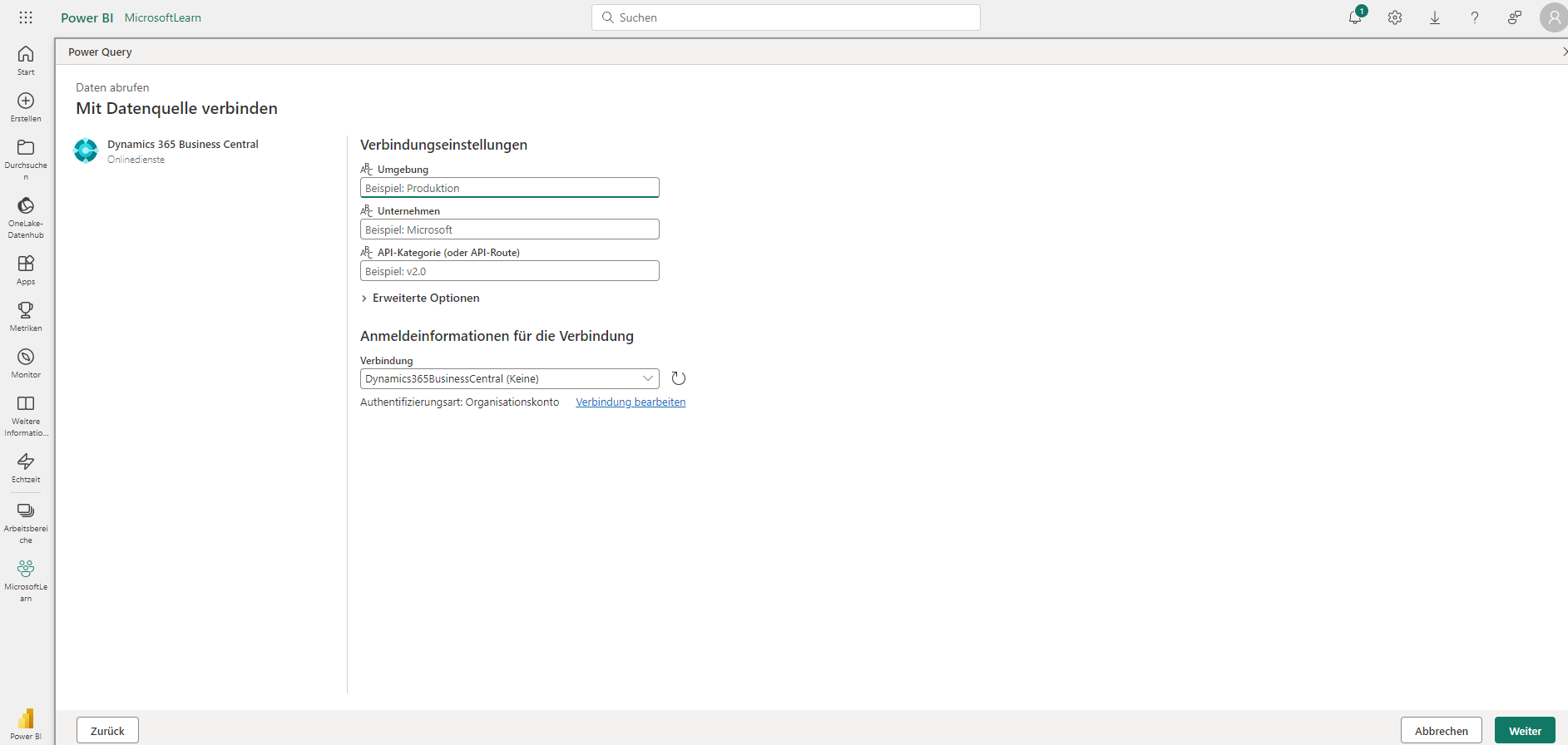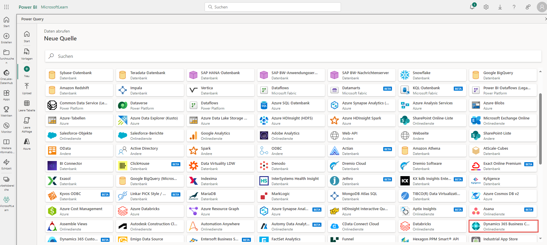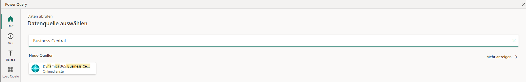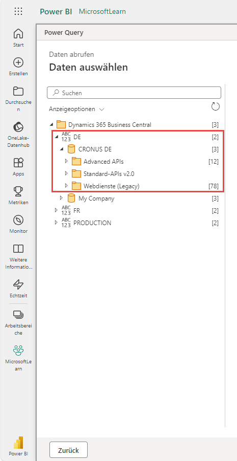 Wählen Sie als Datenquelle Dynamics 365 Business Central aus.