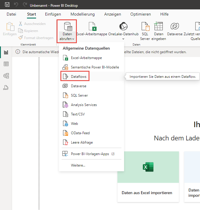 Wählen Sie in Power BI Desktop die Option Daten abrufen, Dataflows aus.
