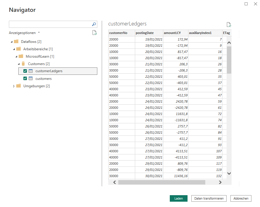 Öffnen Sie im Navigator, der geöffnet wird, Ihren Arbeitsbereich und Ihren Dataflow. Wählen Sie dann die Tabellen aus Ihrem Dataflow aus: