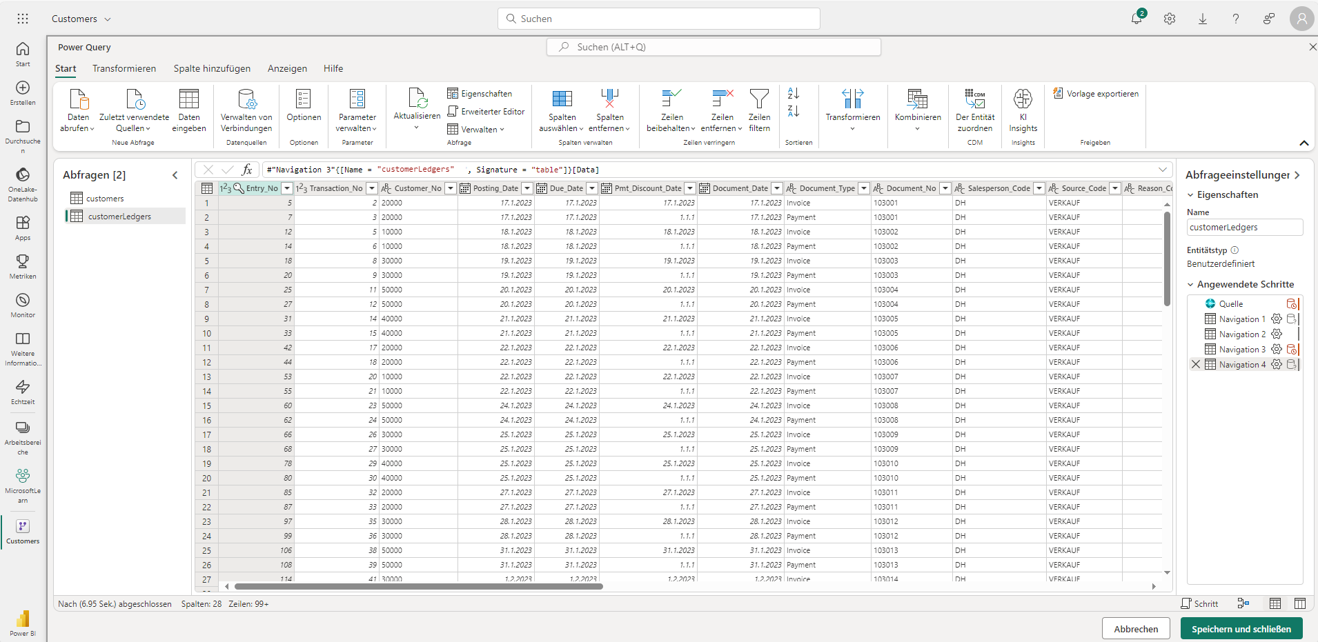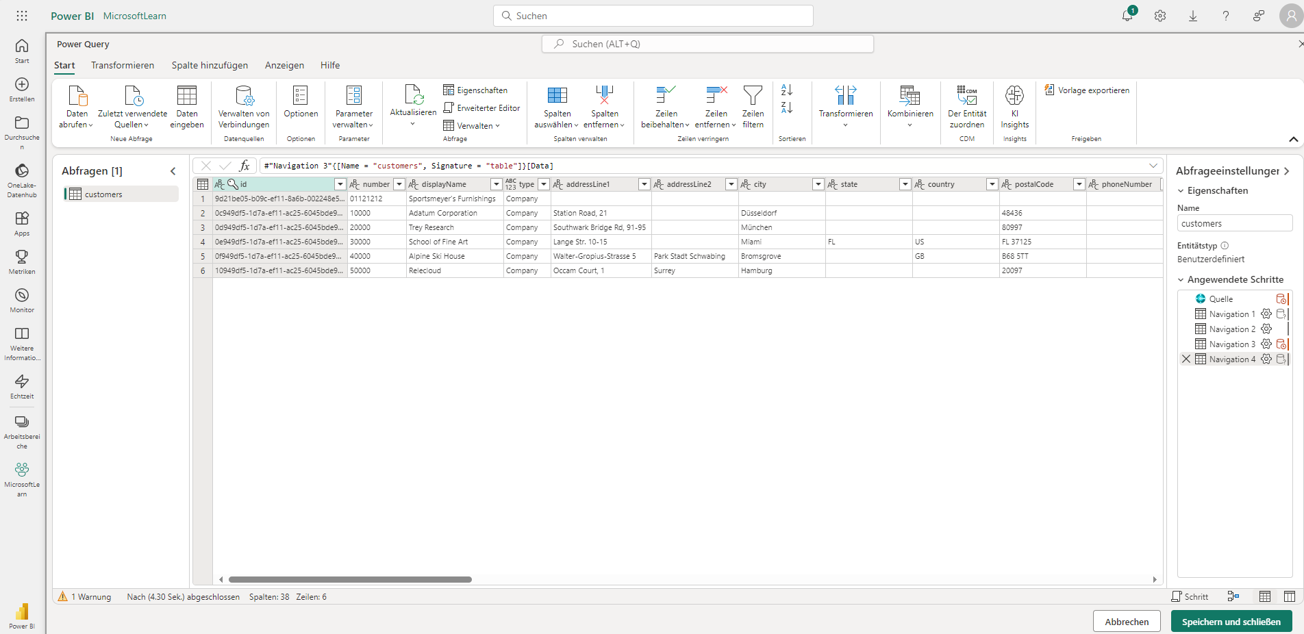 In dem sich öffnenden Fenster wird eine typische Power Query-Oberfläche angezeigt. Hier können Sie bei Bedarf Datentransformationen durchführen, Filter anwenden, neue Spalten erstellen ...