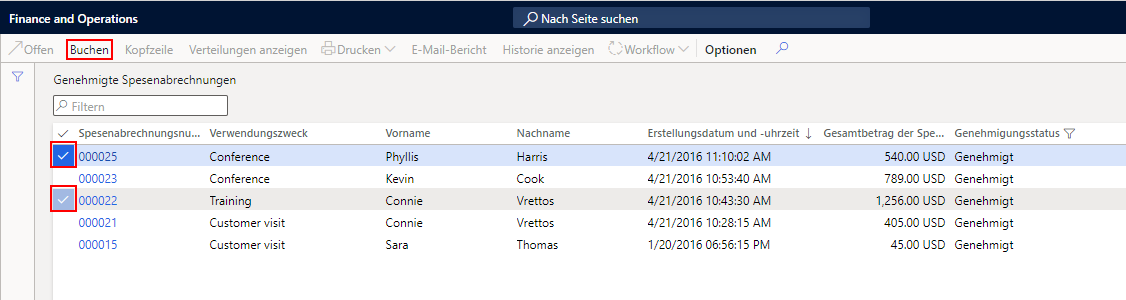 - Wählen Sie die Spesenabrechnungen aus, die Sie buchen möchten.