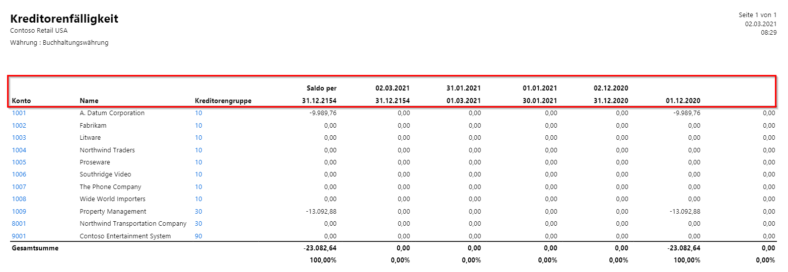 Der Fälligkeitsbericht für Kreditoren zeigt die folgenden Kopfzeileninformationen an: