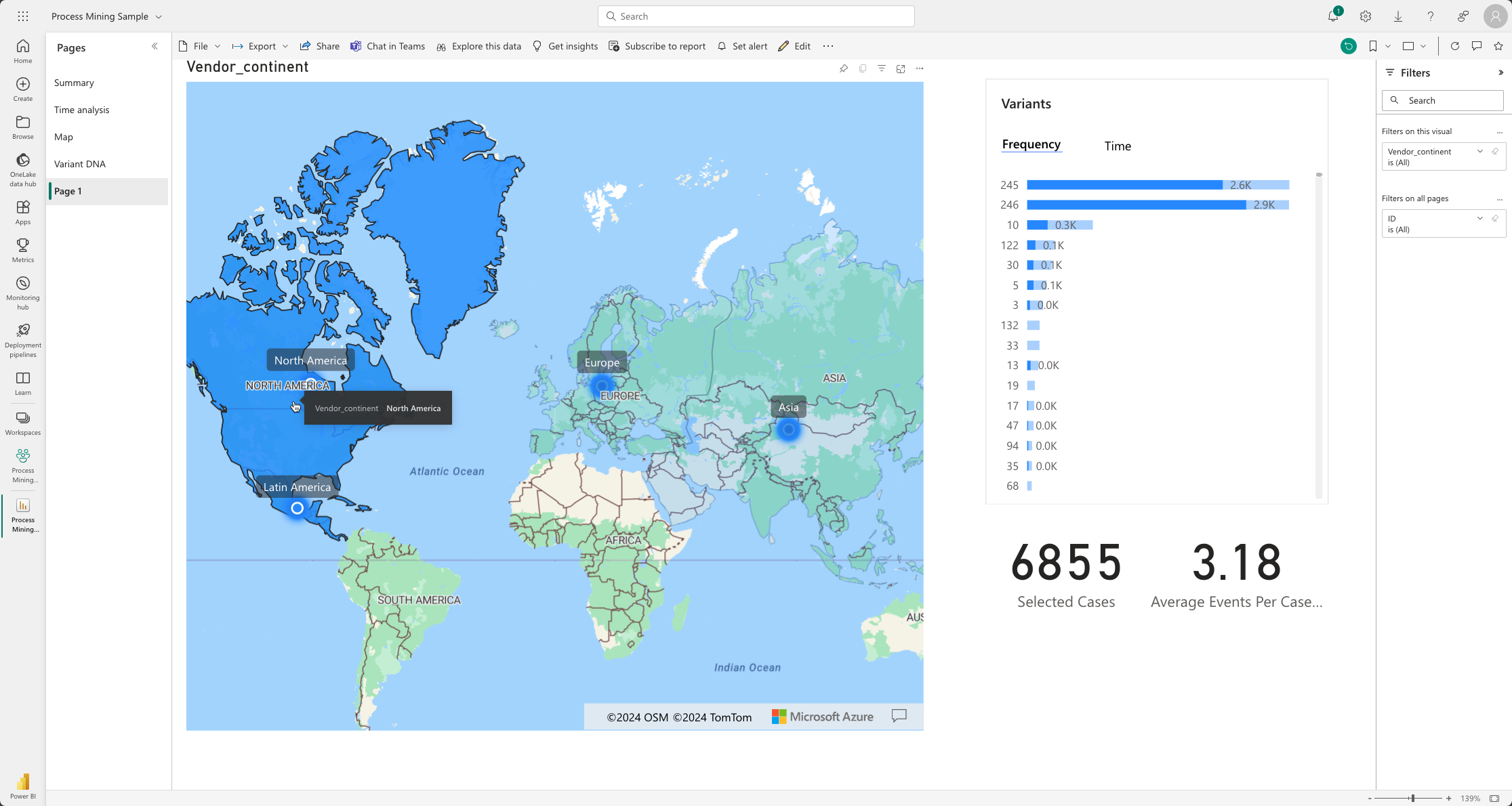 In diesem Abschnitt erfahren Sie alles über das Erstellen einer neuen Seite in Ihrem Bericht und das Hinzufügen einer Zuordnungsdarstellung von Vendor_continent. Dann wird Ihnen gezeigt, wie Sie ein Varianten-Balkendiagramm hinzufügen, das aus der Registerkarte Zusammenfassung kopiert wurde, eine vorhandene Kennzahl für die Gesamtzahl der ausgewählten Fälle und die neu erstellte Kennzahl für die durchschnittliche Ereignisanzahl für jeden Fall. Danach können Sie einen Kontinent und die Varianten auswählen. Die Anzahl der Fälle und die durchschnittliche Anzahl der angezeigten Ereignisse zeigen die von Ihnen getroffene Auswahl an.