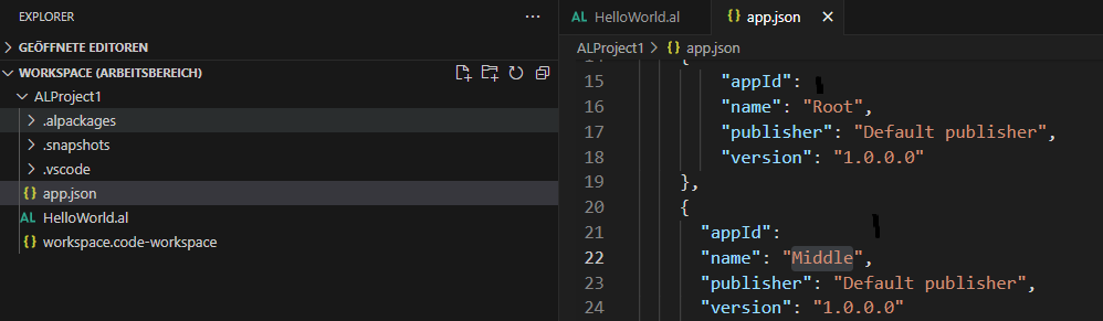 Visual Studio Code bietet die Multi-root workspaces (Arbeitsbereiche mit mehreren Stämmen)-Funktion, mit der Sie verschiedene Projektordner in einem Arbeitsbereich gruppieren können. Die AL Language-Erweiterung unterstützt auch die Multi-root-Funktionalität und ermöglicht Ihnen die Arbeit mit mehreren AL-Ordnern, einschließlich Wurzeln und Projekten in einem Arbeitsbereich.