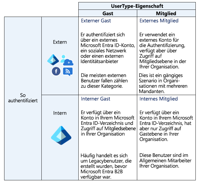 Externe Gäste und externe Mitglieder sind B2B-Benutzer für die Zusammenarbeit, die unter externe Identitäten in microsoft Entra ID fallen, die in der nachfolgenden Einheit beschrieben werden.