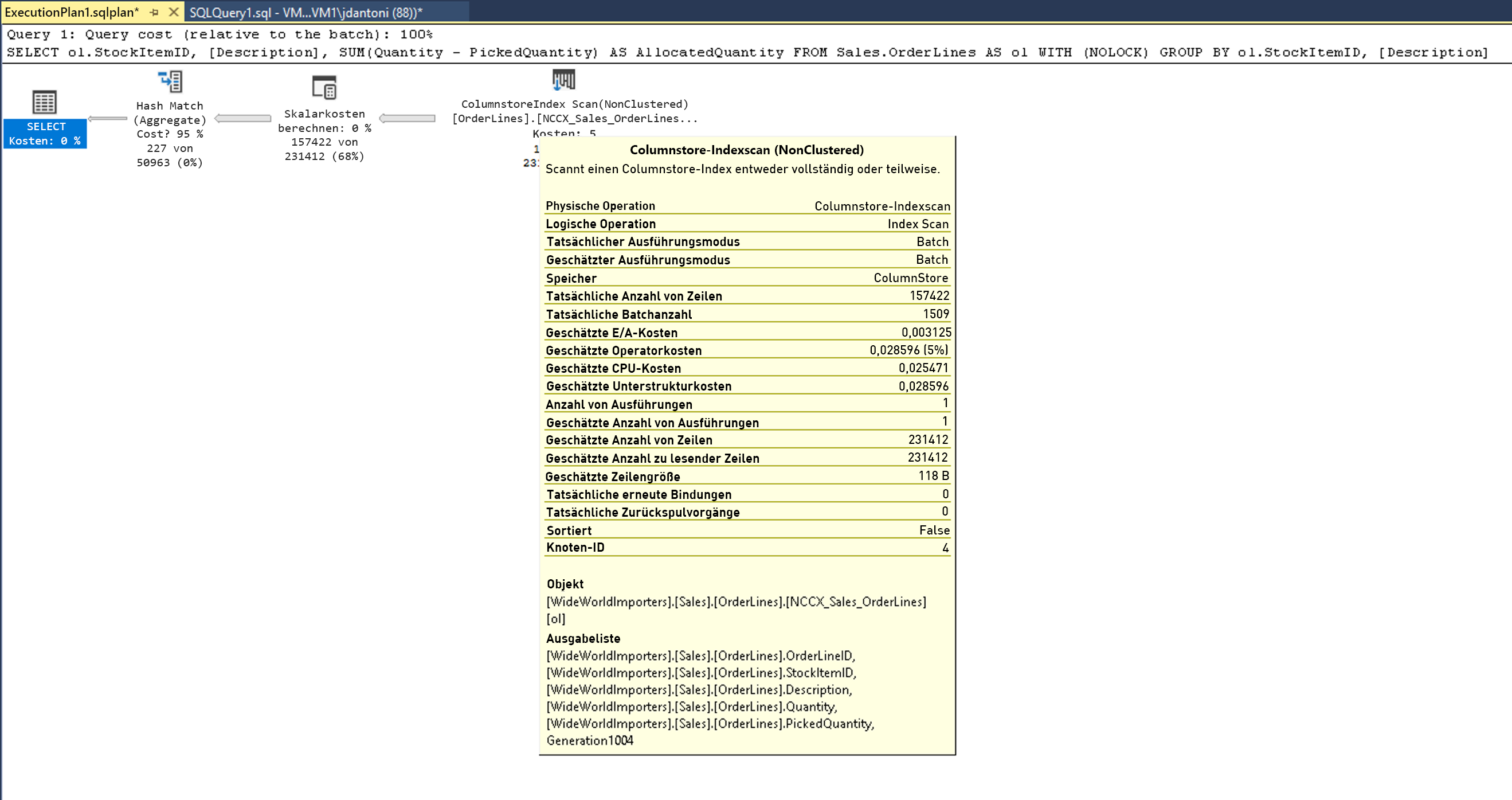Diese Abfrage verknüpft die Tabelle StockItems mit der Tabelle StockItemHoldings. Die Werte in der Spalte StockItemID sind gleich. Die Datenbank-Engine muss zunächst diese Zeilen ermitteln, bevor die restliche Abfrage verarbeitet werden kann.