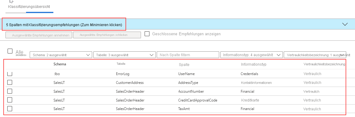 Im Beispiel werden fünf Spalten für die Klassifizierung empfohlen. Die Eigenschaften "Informationstyp " und "Vertraulichkeitsbezeichnung " scheinen mit dem Spaltennamen und dem allgemeinen Zweck konsistent zu sein. Da die Empfehlungen jedoch auf dem Spaltennamen basieren, würde eine Spalte mit dem Namen "Spalte1 ", die E-Mail-Adressen enthält, nicht als vertrauliche persönliche Informationen empfohlen.