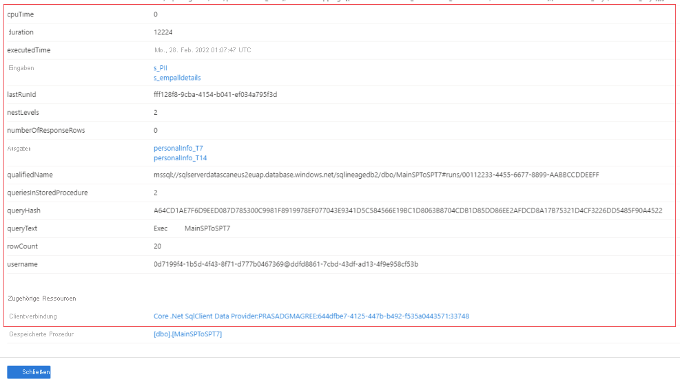 Wählen Sie den Link für gespeicherte Prozeduren neben „Ausführungen“ aus, um die Übersicht über die Ausführung einer gespeicherten Azure SQL-Prozedur anzuzeigen. Wechseln Sie zur Registerkarte „Eigenschaften“, um die erweiterten Laufzeitinformationen aus den gespeicherten Prozeduren anzuzeigen. Beispiel: executedTime, rowcount, Clientverbindung usw.