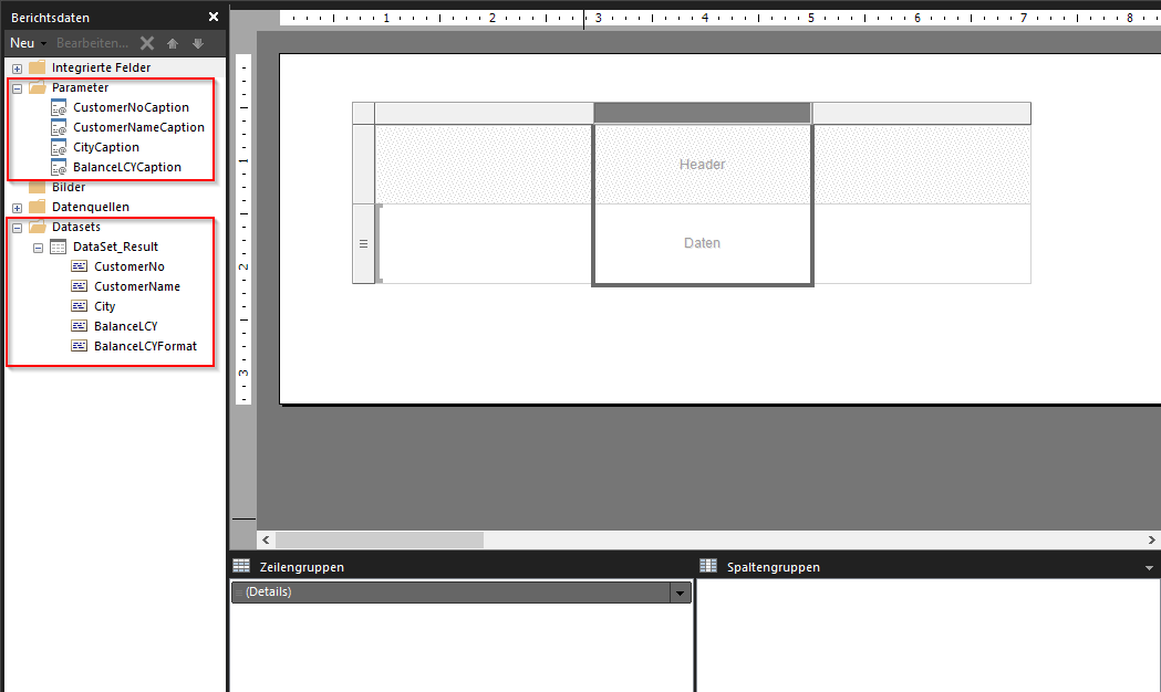 Wenn Sie den Wert Beschriftung eines Feldes als Beschriftung in einem Berichtslayout verwenden möchten, dann müssen Sie die Beschriftung in das Dataset aufnehmen. Wenn Sie dem Dataset Tabellenfelder hinzufügen, können Sie die Eigenschaft IncludeCaption auf true angeben, um festzulegen, dass die Beschriftung für das Feld auch zum Dataset hinzugefügt wird. Wenn Sie die Beschriftung nicht in das Dataset aufnehmen, können Sie in einer mehrsprachigen Anwendung die mehrsprachigen Beschriftungen nicht als Beschriftungen im Bericht verwenden.