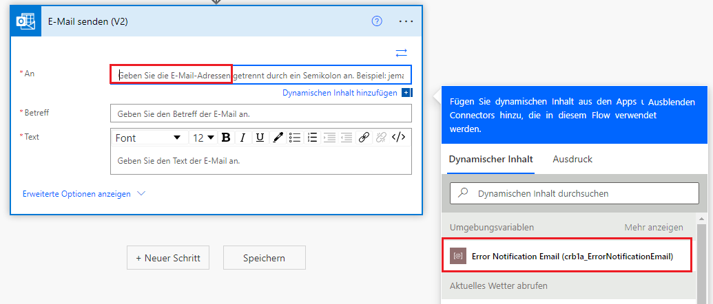 In Ihrem Lösungs-Cloud-Flow können Sie hartcodierte Werte ersetzen, indem Sie auf die Umgebungsvariablen verweisen. Nachdem Sie Variablen in einer Umgebung festgelegt haben, können die verfügbaren Umgebungsvariablen aus dem Feld Dynamische Inhalte ausgewählt werden. Der folgende Screenshot zeigt ein Beispiel für die Verwendung der Variable Error Notification Email, die Sie zuvor festgelegt haben.
