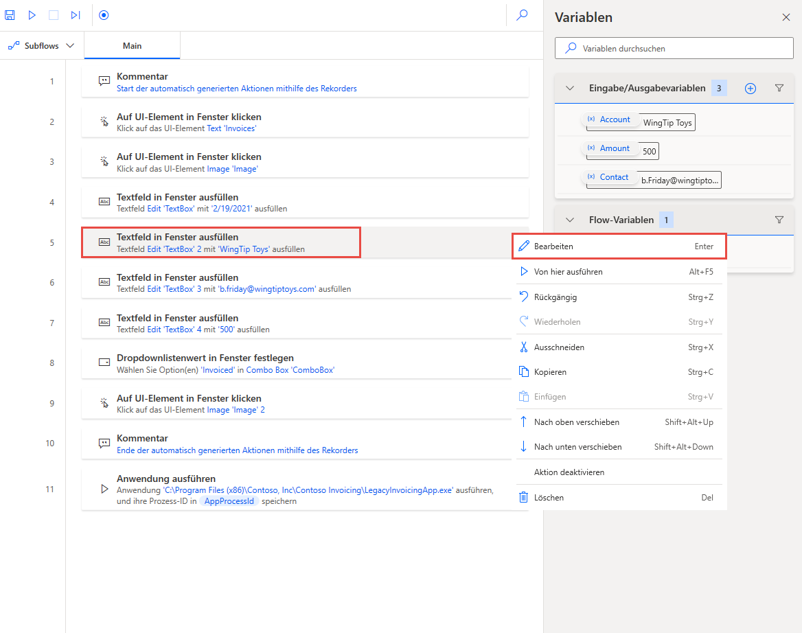 Um Ihre Eingabevariablen zu verwenden, bestimmen Sie, in welchem Schritt Ihres Flows Sie diese Eingabedaten verwenden, und bearbeiten Sie diesen Schritt. Wenn Sie den Desktop-Flow verwenden, der mit der Contoso Invoicing-App erstellt wurde, ist Schritt 5 der erste Schritt, der eine Variable erfordert. Wählen Sie die Auslassungspunkte (...) rechts neben dem Schritt und dann Bearbeiten aus.