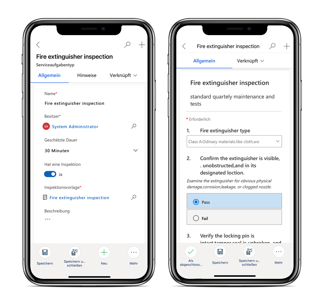 Mitarbeiter im Außendienst, die die mobile Microsoft Dynamics 365 Field Service-App verwenden, können Inspektionen durchführen, ohne die App verlassen zu müssen.