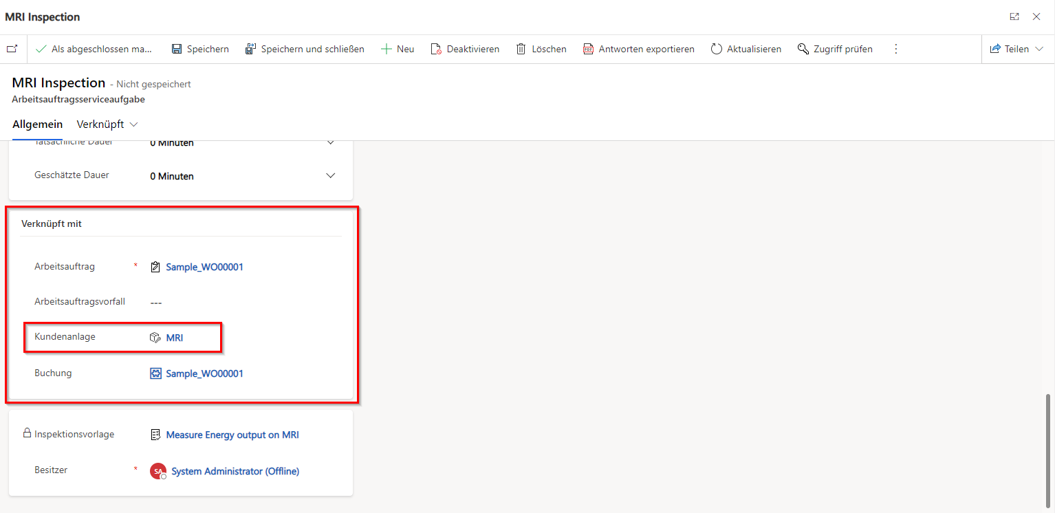 Verwenden Sie den Abschnitt Verknüpft mit, und bearbeiten Sie die mit der Inspektion verknüpfte Aufgabe Arbeitsauftragsservice, um einer Kundenanlage eine Inspektion zuzuordnen.