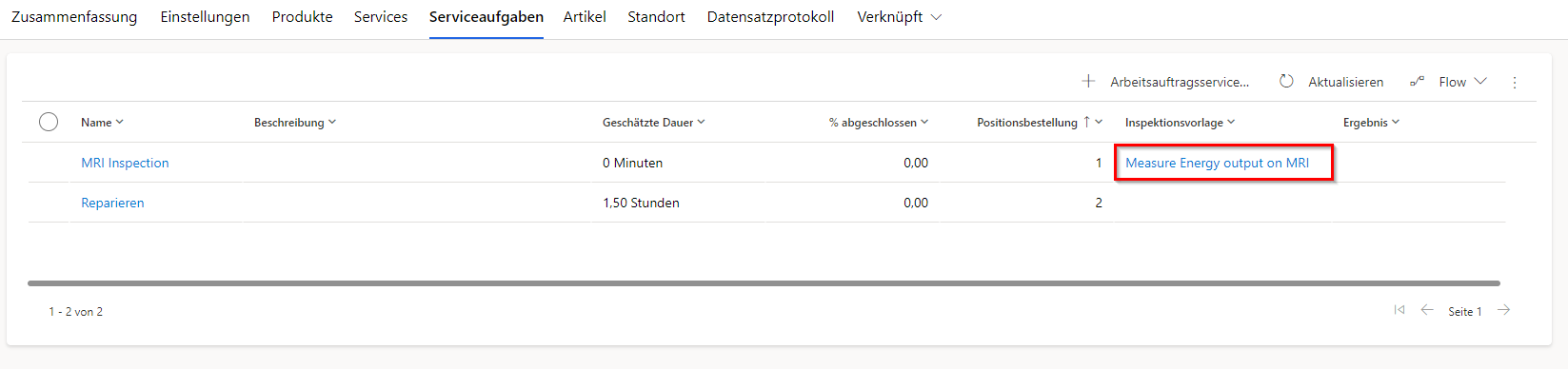 In der Liste der Serviceaufgaben für den Arbeitsauftrag ist die Inspektionsvorlage enthalten, wie im folgenden Screenshot zu sehen.