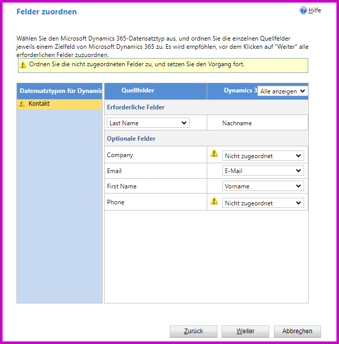 Der Datenimport-Assistent unterstützt die einfache Zuordnung von Spalte zu Spalte und übernimmt auch die Zuordnung von Auswahlwerten und von Suchspalten.