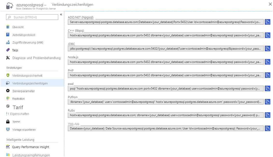 Sie finden die Verbindungsinformationen für Ihre Azure-Datenbank für Den PostgreSQL-Dienst im Azure-Portal auf der Seite "Verbindungszeichenfolgen " für Ihren Dienst. Azure stellt diese Informationen für viele gängige Programmiersprachen und Frameworks bereit.