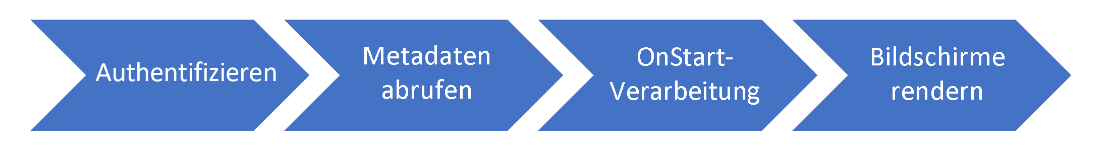 Der erste Eindruck ist wichtig. Der erste Eindruck, den App-Benutzer erhalten, ist die Zeitspanne, die die App benötigt, um den ersten Bildschirm anzuzeigen oder anderes visuelles Feedback, wie etwa Fortschrittsanzeigen, bereitzustellen. Während des Starts führt Ihre App mehrere Schritte aus, um die Darstellung des ersten Bildschirms vorzubereiten: „Authentifizieren“, „Metadaten abrufen“, „OnStart-Verarbeitung“ und „Renderbildschirme“.