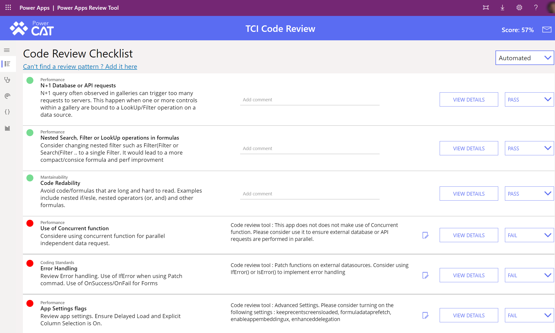 Das Power Apps-Überprüfungstool ist eine weitere Option zum Bewerten von Apps. Dieses Open-Source-Tool ist als Lösung verpackt, die Sie in Ihre Microsoft Dataverse-Umgebung importieren können. Nachdem Sie das Tool importiert haben, können Sie es verwenden, um Apps in Ihrer Umgebung zu bewerten. Sie können auch .msapp-Dateien zur Bewertung hochladen. Die automatisierte Überprüfung kann Ihre App anhand einer anpassbaren Prüfliste mit bewährten Methoden überprüfen und viele häufige Probleme identifizieren, die sich auf die Startzeit der App und die allgemeine Leistung Ihrer Apps auswirken können. Nach Abschluss der automatischen Überprüfung können Sie eine Liste anzeigen, aus der hervorgeht, in welchen Bereichen Ihre App gut funktioniert und in welchen Bereichen sie verbessert werden kann.