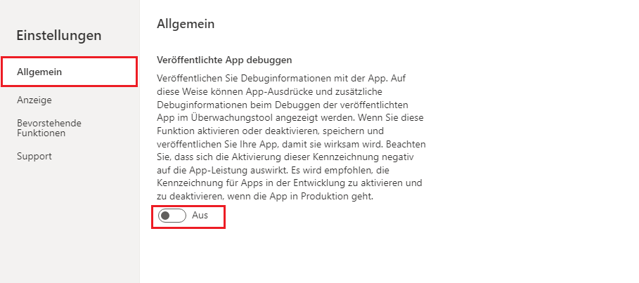 App-Einstellungen können einen erheblichen Einfluss auf die Leistung Ihrer App haben. Überprüfen Sie daher bei jedem App-Update die App-Einstellungen und deren Aktivierungsstatus. Bei älteren Apps sind die neuesten App-Einstellungsoptionen möglicherweise nicht automatisch aktiviert, um sicherzustellen, dass die neue Option vorhandene Apps nicht beschädigt. Möglicherweise haben Sie auch eine Einstellung zur Behebung eines Problems aktiviert, nach Abschluss dieses Vorgangs jedoch vergessen, die Einstellung zu deaktivieren. Ein gutes Beispiel für dieses Szenario ist die Option Veröffentliche App debuggen. Durch die Aktivierung dieser Option können mehr Debuginformationen angezeigt werden, wenn Sie den App-Monitor zur Behandlung von Problemen mit der veröffentlichten App verwenden. Wenn diese Option aktiviert ist, kann sie sich negativ auf die Leistung auswirken und sollte in der Produktion nicht aktiviert bleiben.