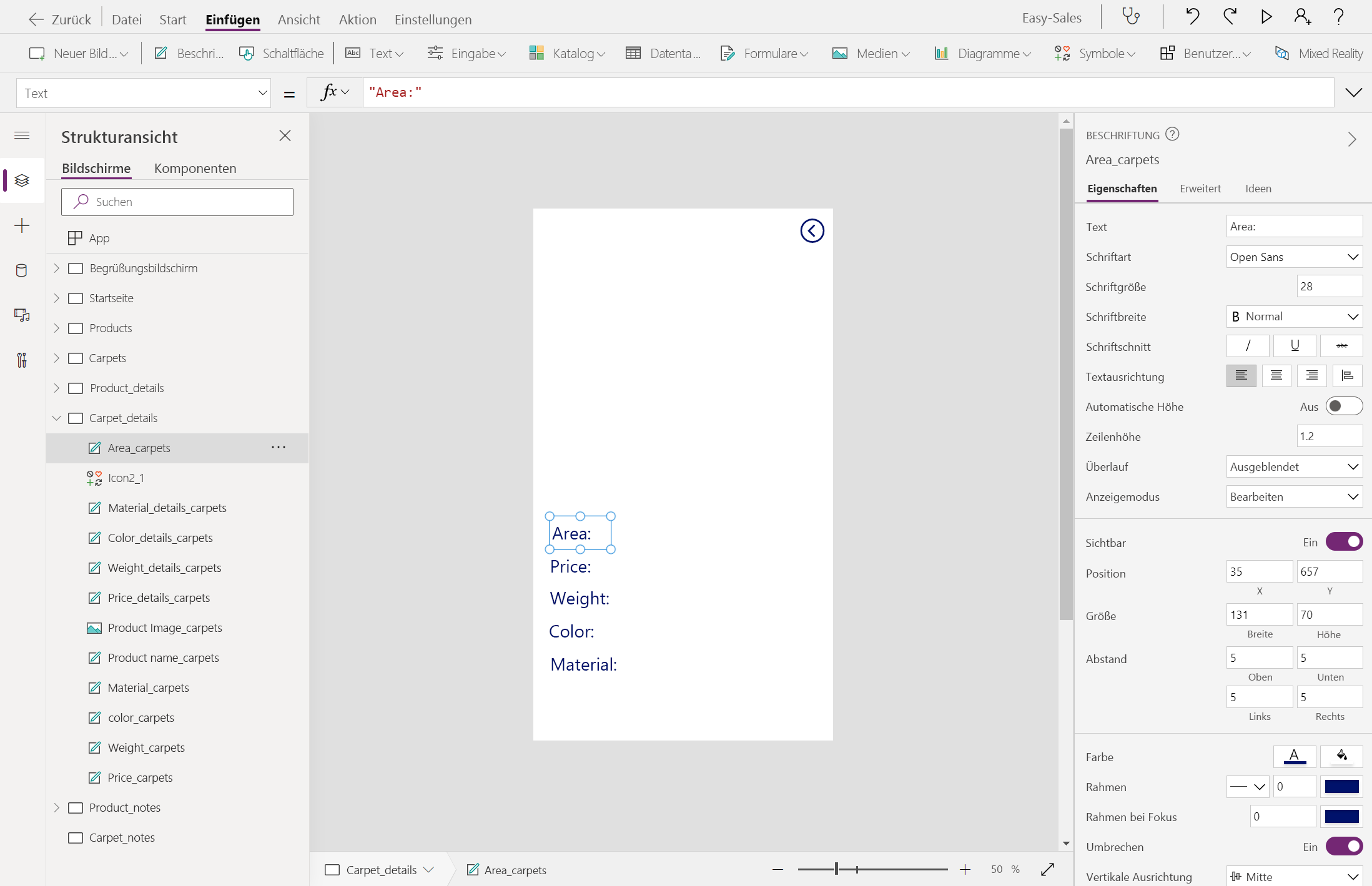 Fügen Sie neben der bezeichnung Area_carpets eine weitere leere Bezeichnung hinzu, und konfigurieren Sie dann die Text-Eigenschaft der leeren Bezeichnung wie folgt, um den berechneten Bereich anzuzeigen: