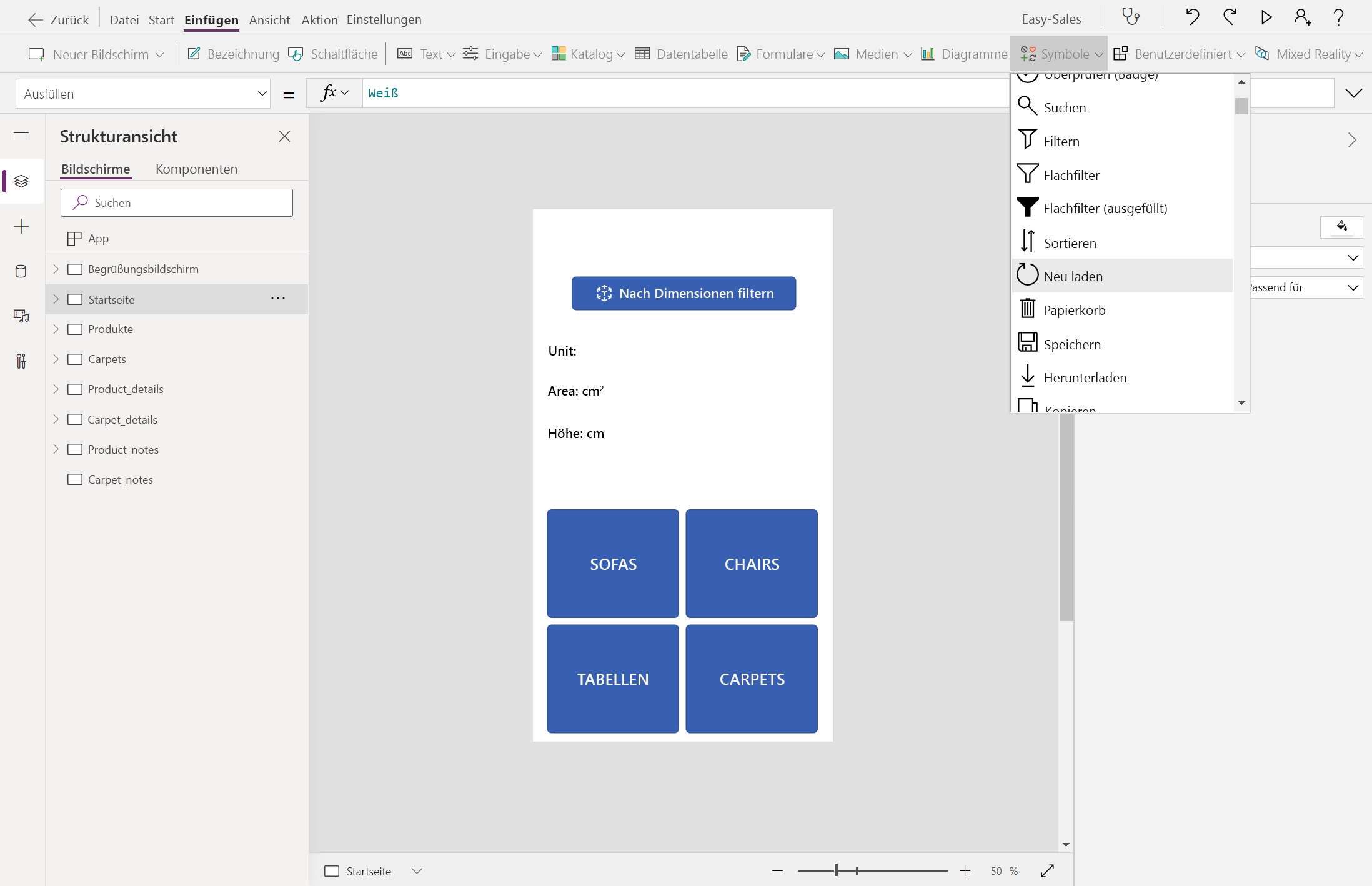 Fügen wir ein Symbol " Neu laden " hinzu, damit benutzer die Maße wiederholen können, wenn sie nicht zufrieden sind. Erweitern Sie auf der Registerkarte "Einfügen " das Dropdownmenü "Symbole ", und wählen Sie das Symbol " Neu laden " aus.