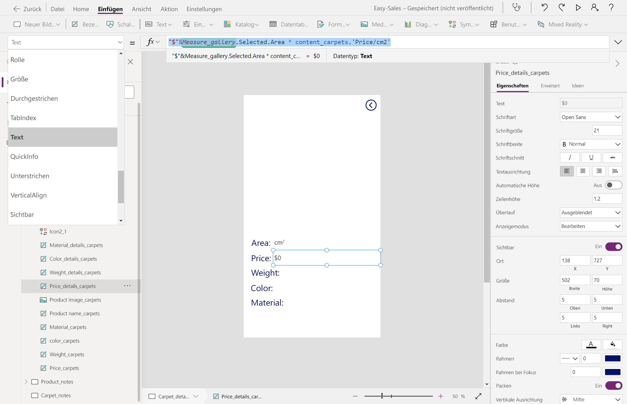 Measure_gallery.Selected.Area&"cm²"Konfigurieren Sie die Bezeichnung neben der Preisbezeichnung wie folgt, um den berechneten Preis anzuzeigen: