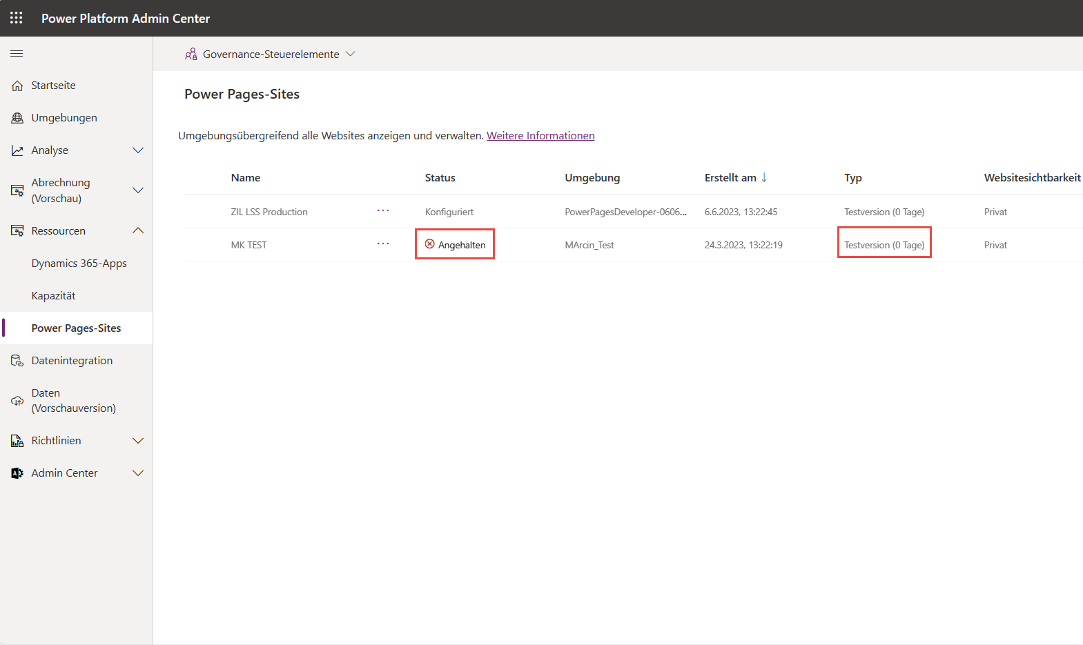 Auf der Power Pages-Startseite können Sie Websites erstellen und löschen. Eine Power Pages-Website wird immer als 30-Tage-Testversion erstellt. Nach Ablauf wird die Website gesperrt. Sieben Tage nach der Sperrung wird der Testwebsite-Host gelöscht. Sie können den Status der Website im Power Platform Admin Center unter Ressourcen > Power Pages-Websites überprüfen.