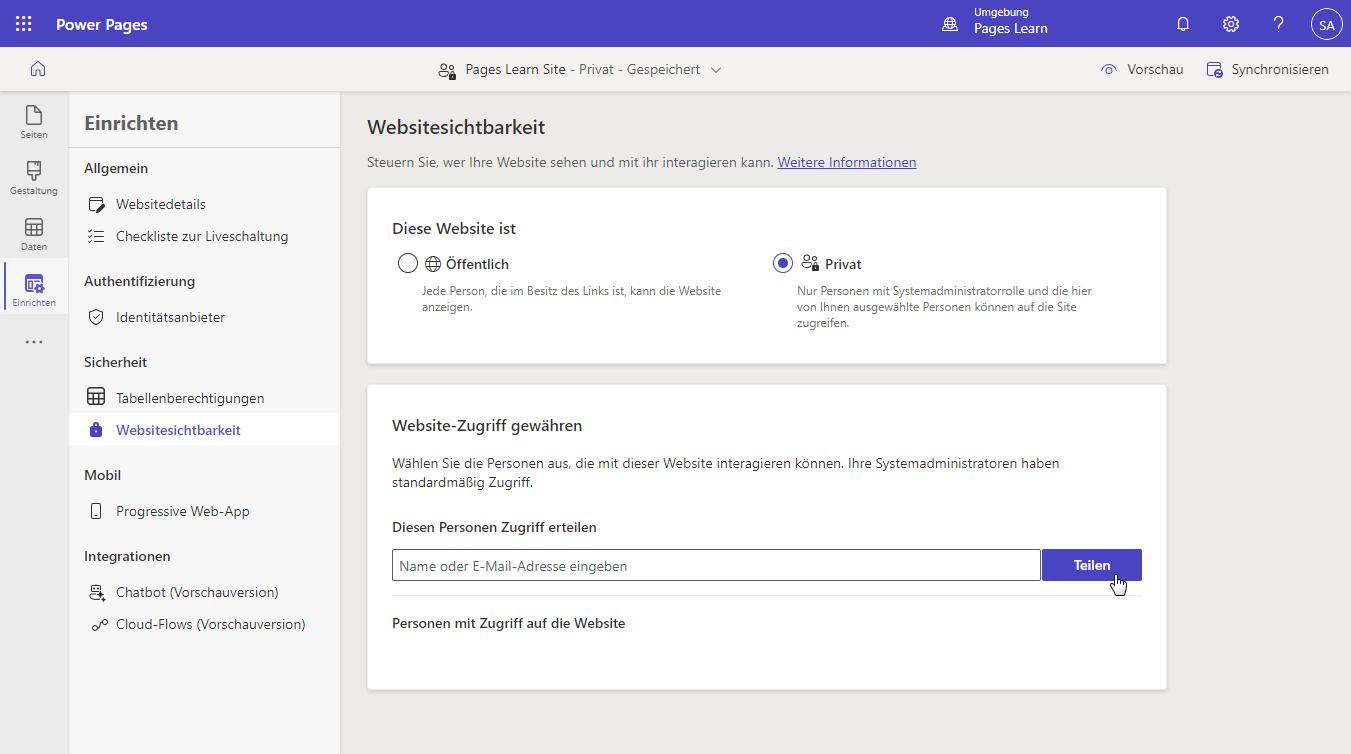 Weitere Informationen finden Sie unter Websitesichtbarkeit in Power Pages.