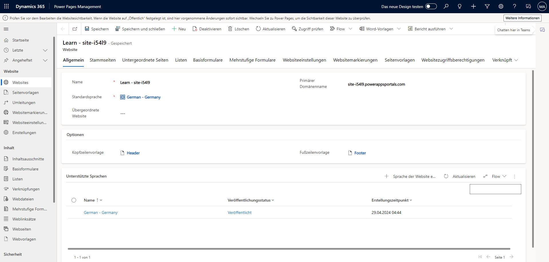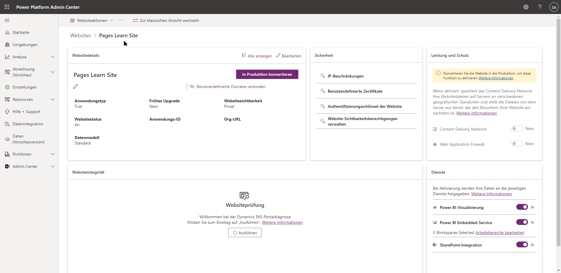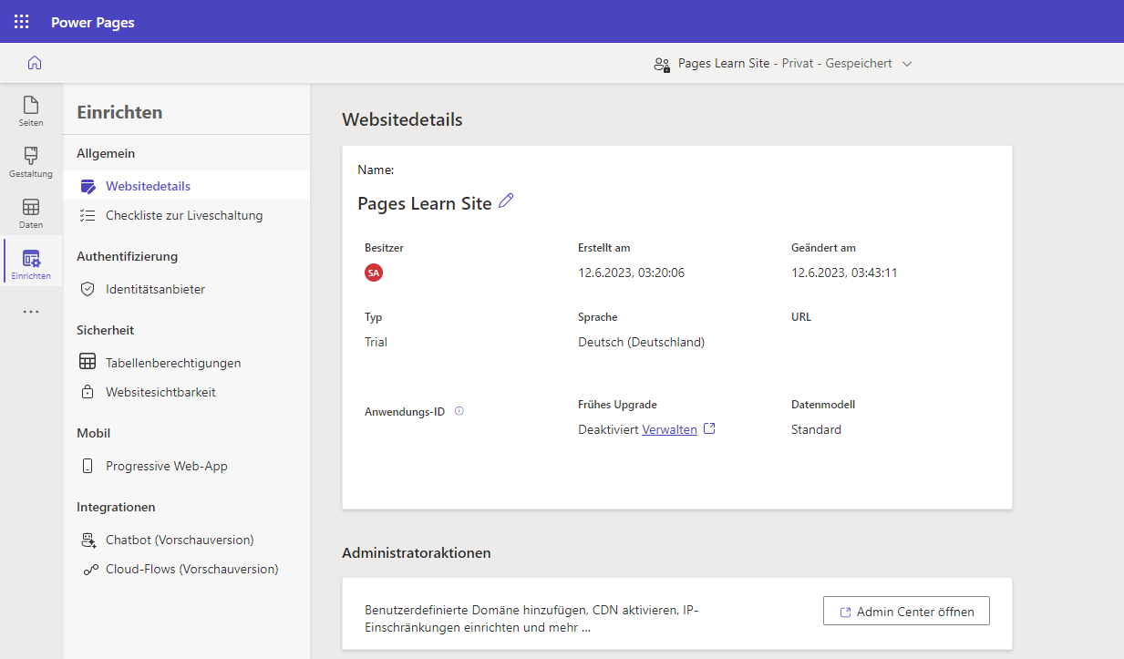 Weitere Informationen finden Sie unter Power Pages-Verwaltungs-App – Übersicht.
