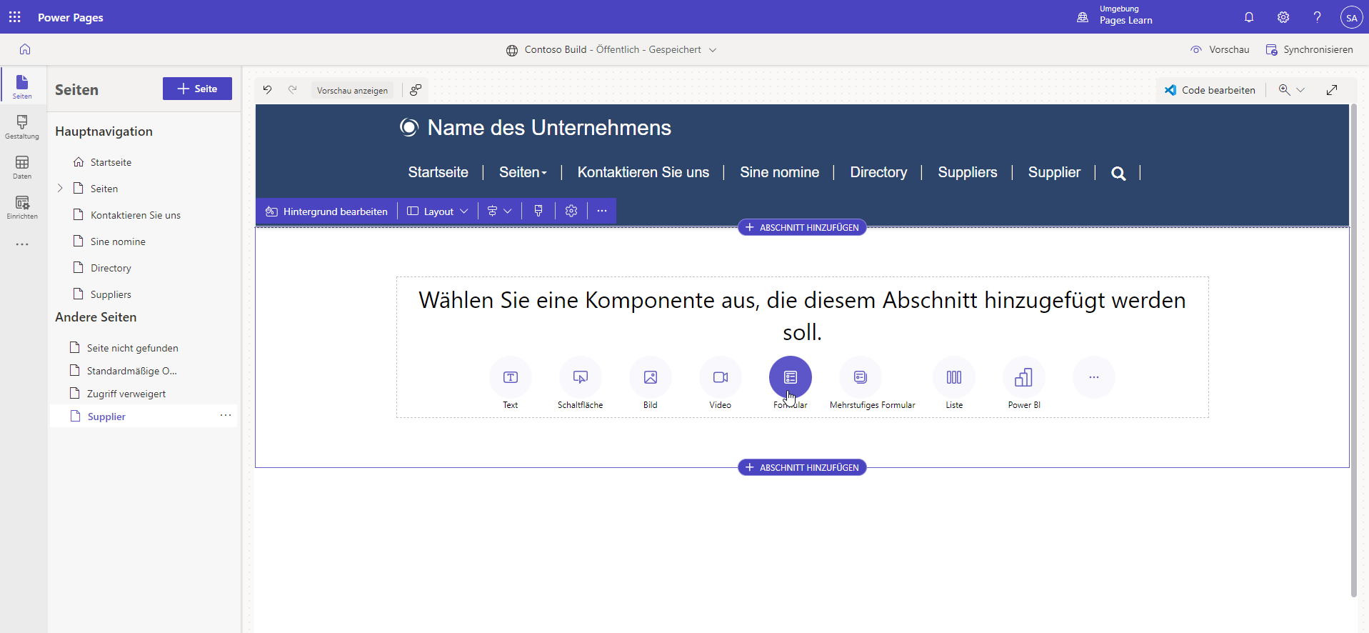 Sie können einer Webseite ein Formular aus dem Komponentenmenü von Power Pages-Designstudio hinzufügen.