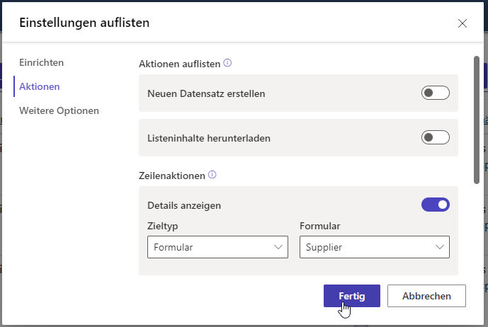 • Ein Formular kann explizit als Ziel für eine Listenaktion wie das Erstellen, Aktualisieren oder Bearbeiten festgelegt werden. In diesem Fall wird das Formular in einem modalen Popupfenster gerendert. Wenn das Formular in einem Popup-Fenster gerendert wird, gelten bestimmte Einschränkungen. Das Funktion zum Erstellen verwandter Zeilen aus Unterrastern ist zum Beispiel nicht verfügbar.