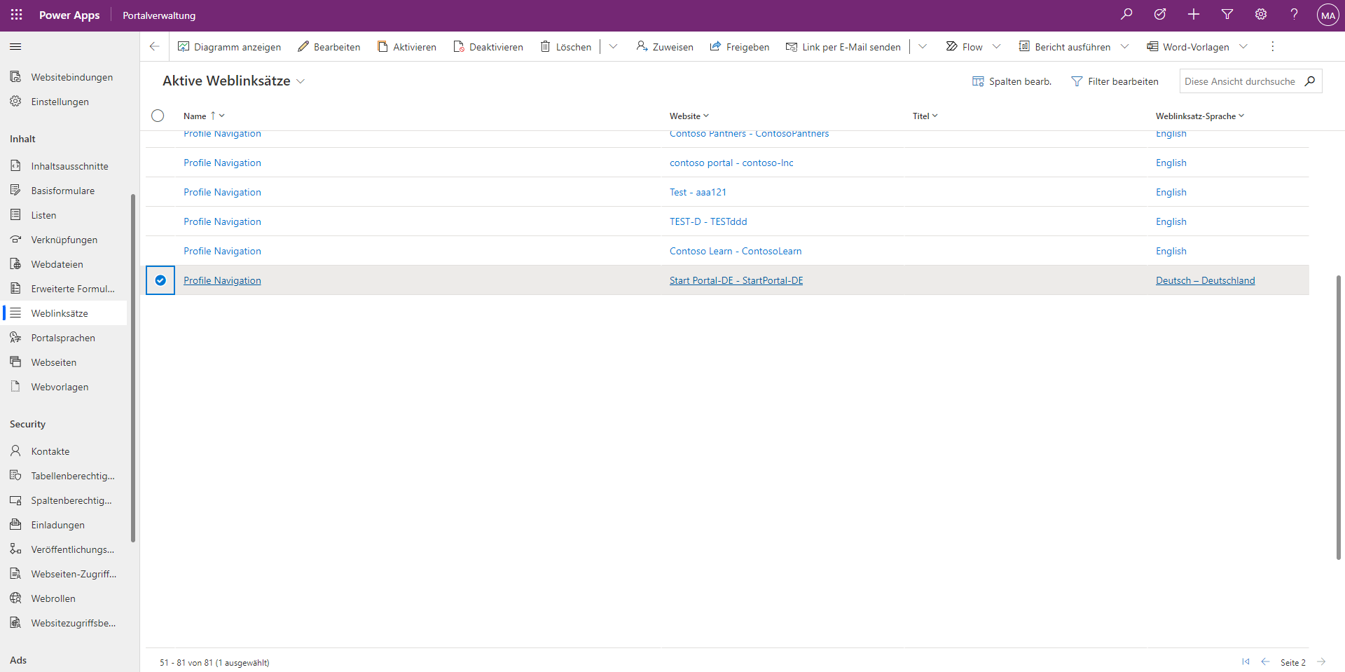 Wählen und öffnen Sie die Zeile Weblinksätze mit dem Namen Sekundäre Navigation.