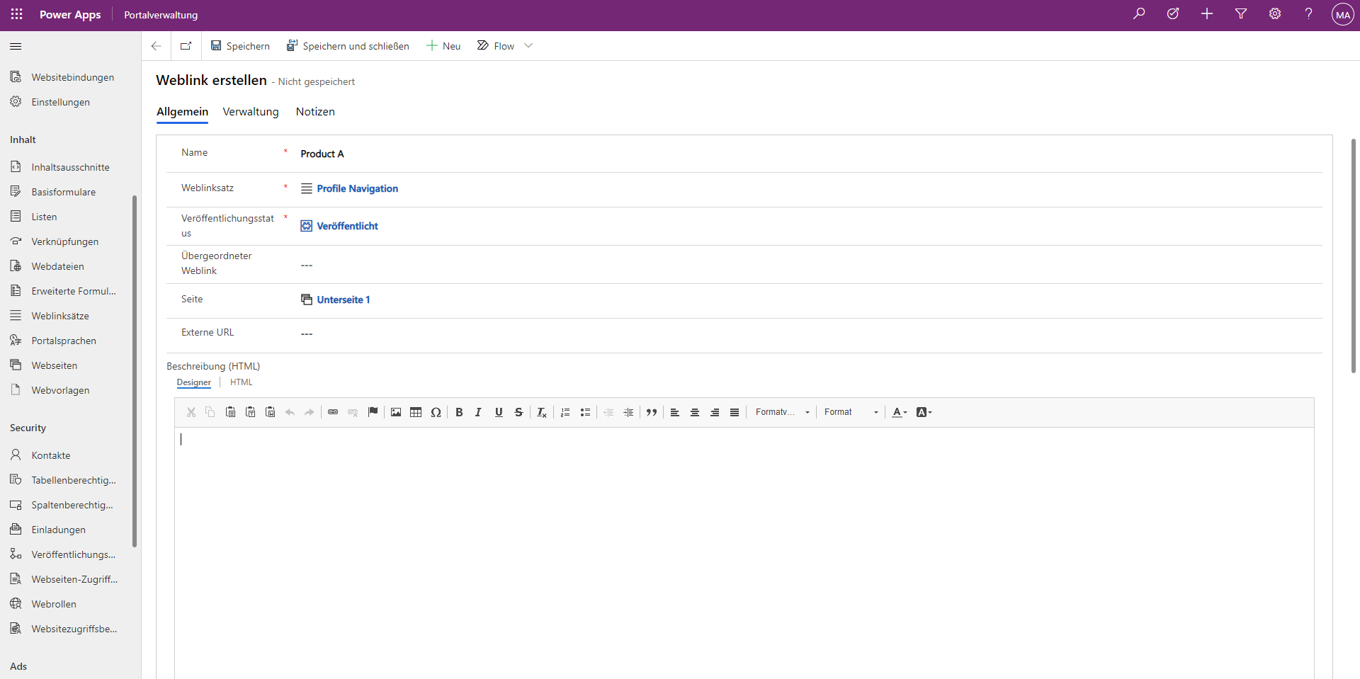 Verwenden Sie die App „Portalverwaltung“, um einem vorhandenen Weblinksatz neue Weblinks hinzuzufügen.