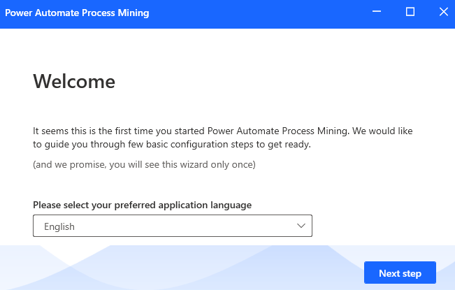 Die Anwendung sollte nach Abschluss der Installation starten. Wählen Sie Ihre Sprache und dann Nächster Schritt aus. Wählen Sie für diese Übung Englisch aus.