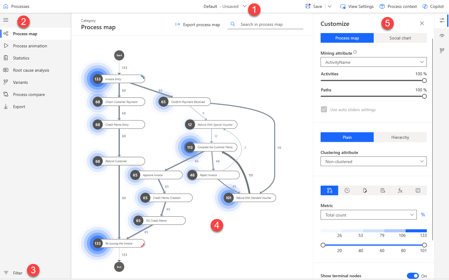 Prozesszuordnung – Stellt die Abfolge von Aufgaben in einem Prozess auf Basis der Daten dar, die Sie mit Filtern und Zeitmetriken anpassen können.
