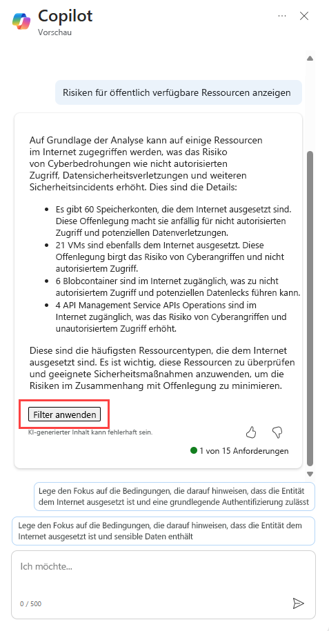 Copilot generiert eine anfängliche Analyse und Sie können die Empfehlungsliste basierend auf dieser anfänglichen Analyse filtern. Sie können die Ergebnisse weiter verfeinern, indem Sie einen der vorgeschlagenen weiterführenden Prompts auswählen oder einen manuell eingeben und den Filter anwenden.