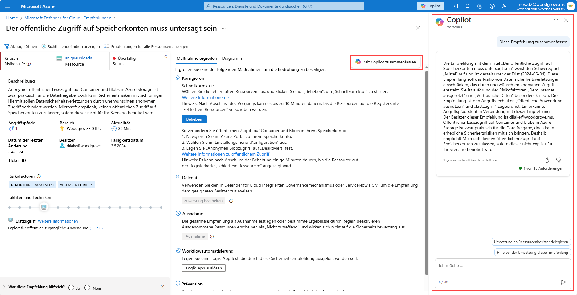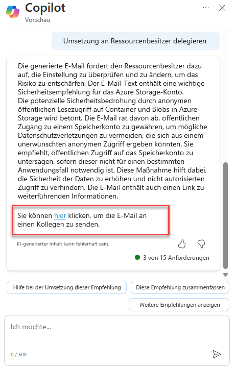 Wenn Sie die Empfehlung besser verstehen, können Sie entscheiden, wie sie am besten behandelt werden soll. Sie können beispielsweise auswählen, dass Copilot Ihnen dabei hilft, die Empfehlung zu korrigieren, die Korrektur an den Ressourcenbesitzer zu delegieren oder bei Bedarf andere Eingabeaufforderungen einzugeben.