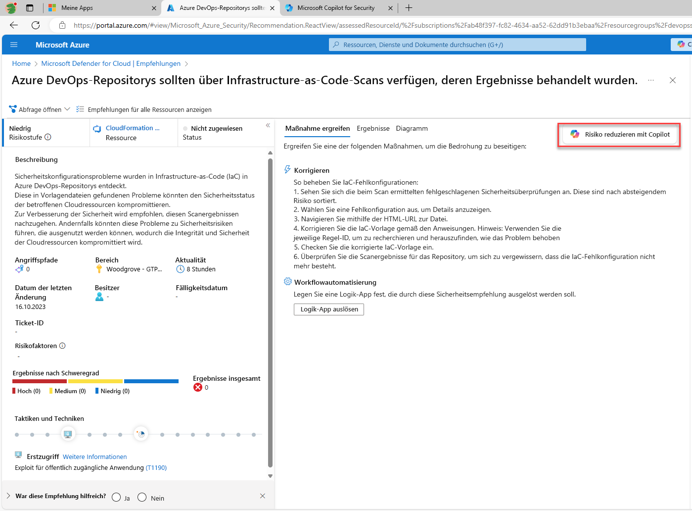 So verwenden Sie Copilot in Defender for Cloud, um den Korrekturprozess für Empfehlungen zu unterstützen: