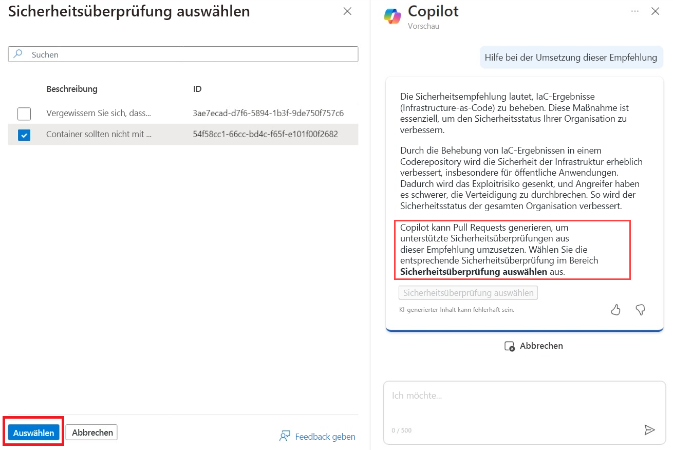 Durch Aktivieren der Option „Sicherheitsüberprüfung auswählen“ kann Copilot Pull-Anforderungen generieren, um unterstützte Sicherheitsprüfungen anhand der Empfehlung zu beheben.
