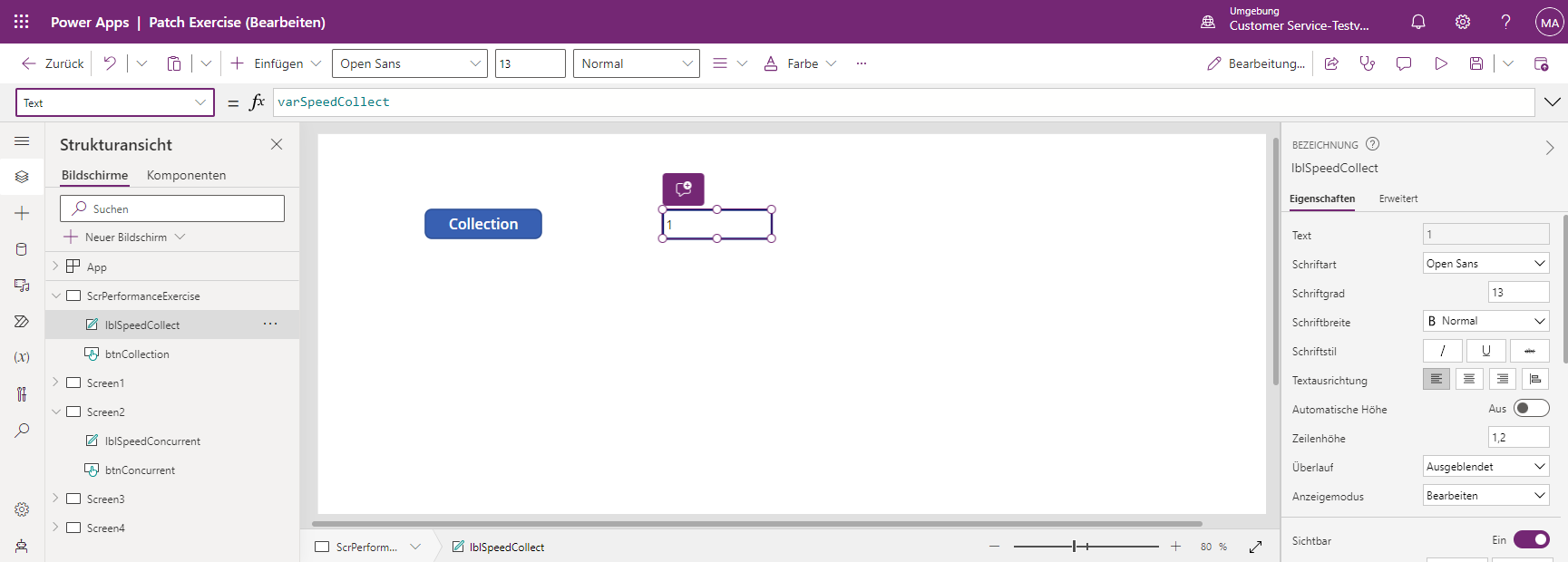 Set(varStart,Now()); Concurrent( ClearCollect(collectFruit, {Name: "banana", Category: "fruit",AvgCost: .49}, {Name: "peach", Category: "fruit",AvgCost: 1.12}, {Name: "strawberry", Category: "fruit",AvgCost: 2.99}, {Name: "apple", Category: "fruit",AvgCost: 0.98}, {Name: "orange", Category: "fruit",AvgCost: 1.49}, {Name: "pear", Category: "fruit",AvgCost: 0.97}, {Name: "cantaloupe", Category: "fruit",AvgCost: 3.99}, {Name: "pineapple", Category: "fruit",AvgCost: 2.49}, {Name: "cherry", Category: "fruit",AvgCost: 4.99}, {Name: "mango", Category: "fruit",AvgCost: .99} ), ClearCollect(collectVegetable, {Name: "carrot", Category: "vegetable",AvgCost: .95}, {Name: "lettuce", Category: "vegetable",AvgCost: 1.69}, {Name: "potato", Category: "vegetable",AvgCost: 5.14}, {Name: "zucchini", Category: "vegetable",AvgCost: 1.99}, {Name: "broccoli", Category: "vegetable",AvgCost: 1.49}, {Name: "cabbage", Category: "vegetable",AvgCost: 2.48}, {Name: "celery", Category: "vegetable",AvgCost: 1.65}, {Name: "asparagus", Category: "vegetable",AvgCost: 2.99}, {Name: "kale", Category: "vegetable",AvgCost: 1.99}, {Name: "cauliflower", Category: "vegetable",AvgCost: 3.24})); Set(varSpeedConcurrent, Text(DateDiff(varStart, Now(), TimeUnit.Milliseconds)));Geben Sie eine weitere Textbeschriftung ein, und richten Sie die Eigenschaft BorderThickness auf 3 ein. Ändern Sie dann den Namen in lblSpeedConcurrent, und richten Sie die Eigenschaft Text auf Folgendes ein: