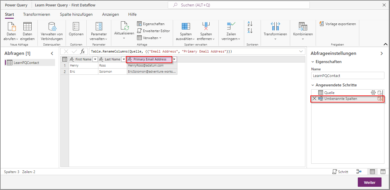 Im Schritt Datentransformation können Sie die Daten transformieren und der Datenquelle Spalten basierend auf Berechnungen, Gruppierungen oder Transformationen anderer Spalten hinzufügen. Zudem können Sie unter vielen anderen die Optionen Entfernen, Umbenennen, Sortieren verwenden. Doppelklicken Sie, und geben Sie der Spalte Email Address in Ihren Daten den Namen Primary Email Address. Beachten Sie, dass im Bereich Abfrageeinstellungen rechts unter Angewandte Schritte der Schritt Umbenannte Spalten aufgeführt ist, den Sie gerade ausgeführt haben.