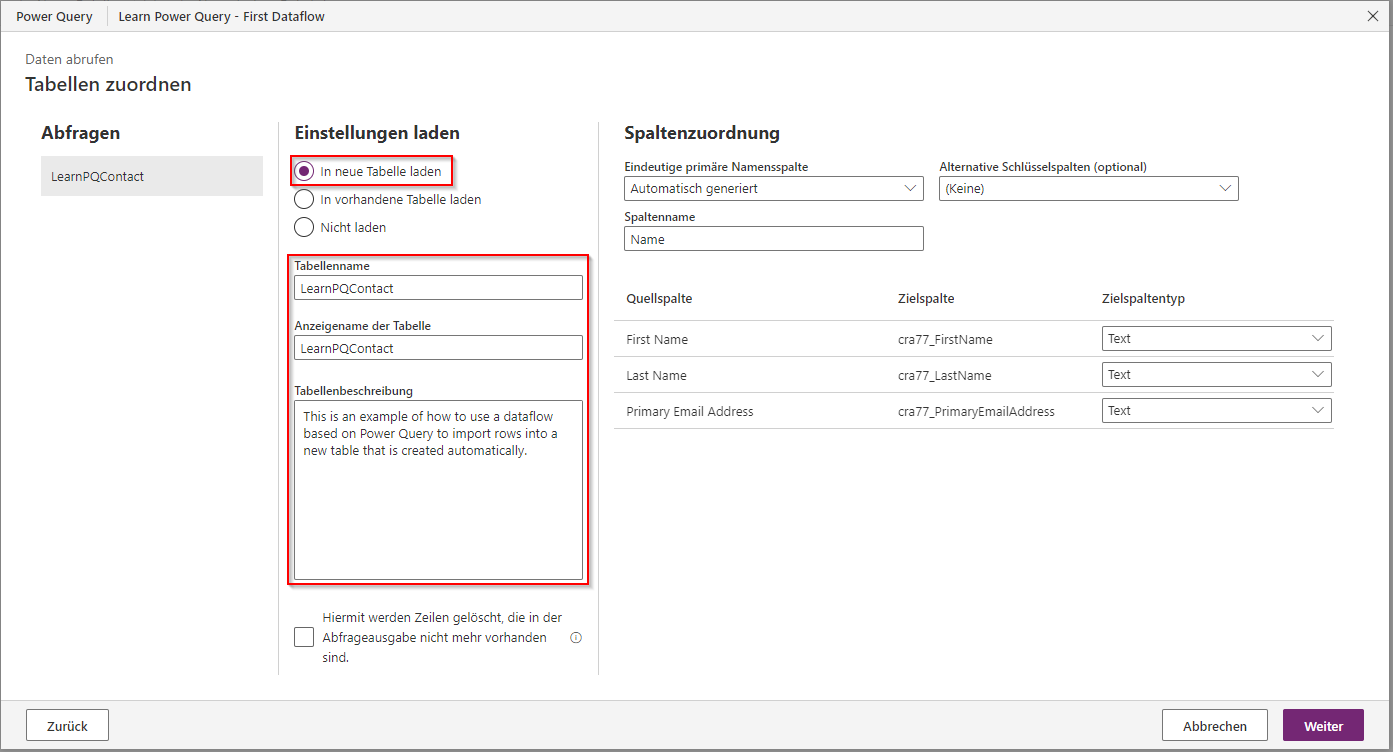 Folgen Sie diesen Schritten, um mit Power Query einen Datenfluss zu erstellen, der Daten in Dataverse erstellt: