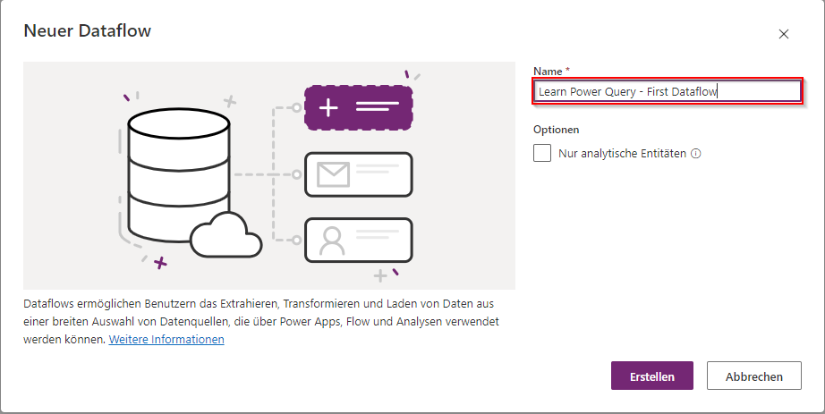 Geben Sie im Fenster für den neuen Datenfluss den Namen für den neuen Datenfluss ein, und klicken Sie dann auf Erstellen.