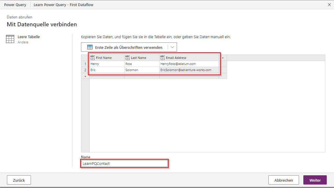 Unter den von uns erstellten Zeilen können wir einige Daten in die Tabelle eingeben. Zudem können wir unserer Tabelle auch einen Namen geben. In diesem Fall entscheiden wir uns für den Namen „LearnPQContact“. Klicken Sie auf Weiter, um diesen Schritt abzuschließen und mit dem Schritt Datentransformation fortzufahren.