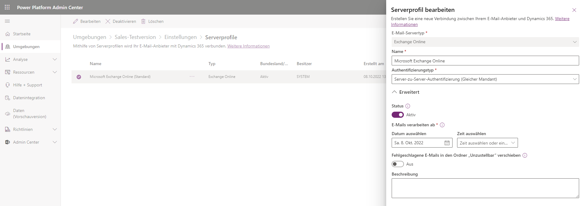 Wenn Ihre Organisation über Microsoft Exchange Online verfügt, wird bei der Bereitstellung einer Dataverse für Apps-Datenbank automatisch ein Standardprofil für die E-Mail-Verbindung mit Exchange Online erstellt. Für diese Verbindung sind die erforderlichen Anmeldeinformationen und Serverinformationen bereits definiert. Um dieses Profil zu überprüfen, navigieren Sie zu den Einstellungen für die Umgebung, in der Sie in Microsoft Power Platform Admin Center arbeiten möchten. Wählen Sie dann Serverprofile im Abschnitt E-Mail aus.