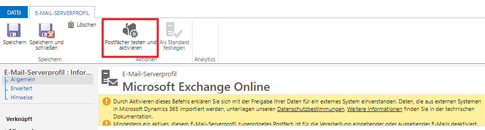 Bevor genehmigte Postfächer vom System verarbeitet werden, müssen sie getestet und aktiviert werden. Sie führen zunächst einen Test durch, um sicherzustellen, dass Dataverse und das verwendete E-Mail-Server-Profil korrekt kommunizieren. Sobald der Test abgeschlossen ist, wird das Postfach für die Verarbeitung aktiviert.