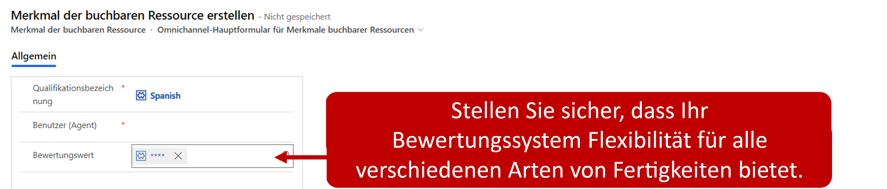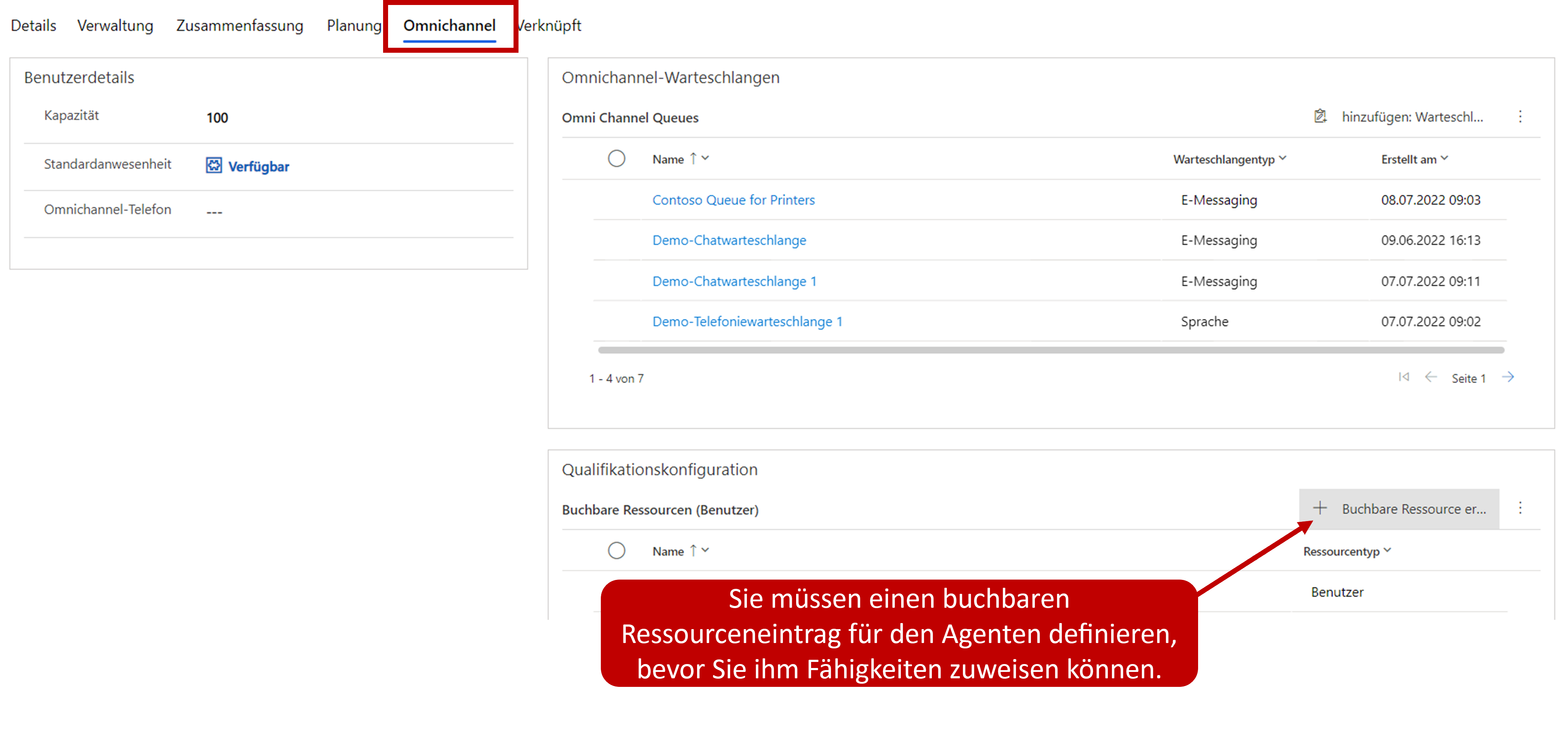 Unterhaltungen, für die bestimmte Fähigkeiten definiert sind, müssen an die am besten geeigneten Mitarbeitern verteilt werden. Jeder Mitarbeiter, der in der qualifikationsbasierten Weiterleitung angewendet wird, benötigt einen buchbaren Ressourcendatensatz, der seinem Benutzerkonto zugeordnet ist. Der buchbare Ressourcendatensatz bietet Ihnen die Möglichkeit, Qualifikationen und Leistungsstufen einzelnen Mitarbeitern zuzuordnen.
